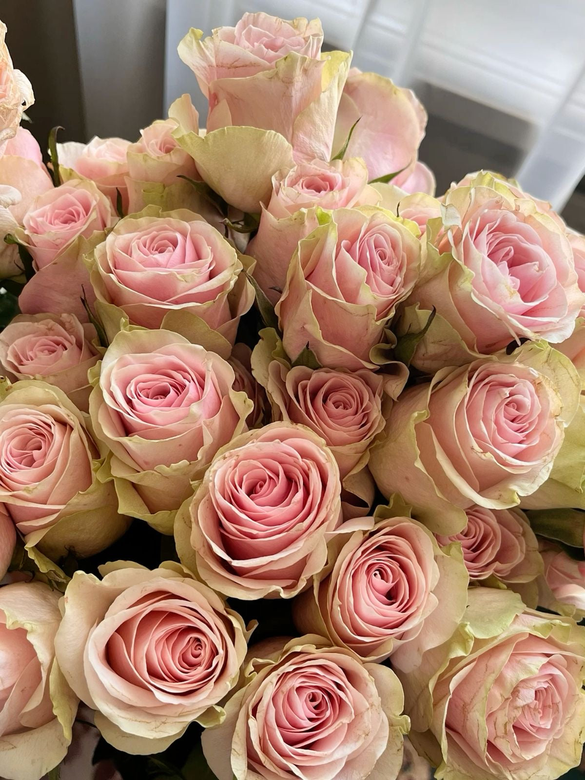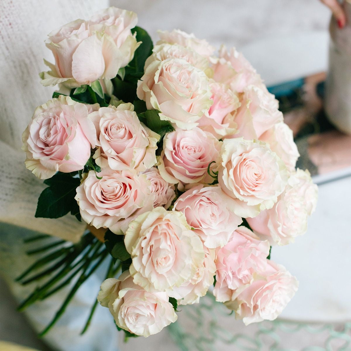 Mazzo composto di rose colombiane giganti della migliore qualità, caratterizzate da una grande apertura del bocciolo e da una lunga durata
