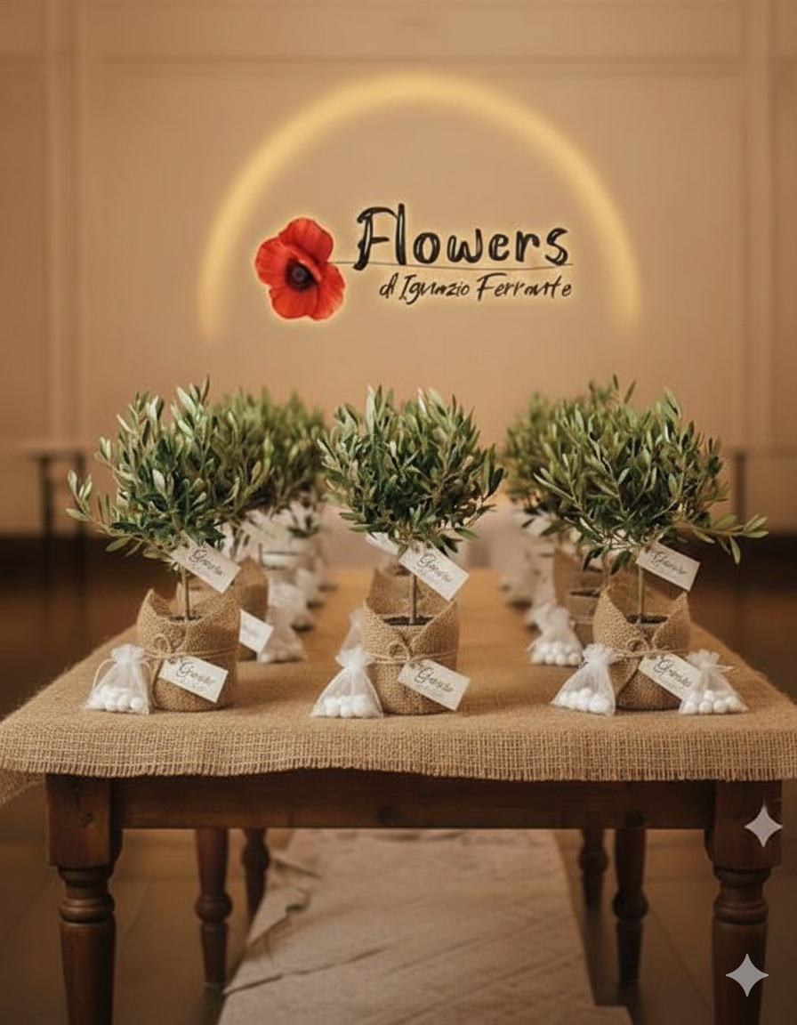 bomboniere di ulivo bonsai con cachepot di ceramica o confezionati con la juta naturale, possono essere fornite anche di mono confetto e targhetta con dedica a scelta del cliente la consegna è omaggio. i tempi di spedizione sono di 1/2 settimane a seconda della disponibilità e della quantità del prodotto da spedire